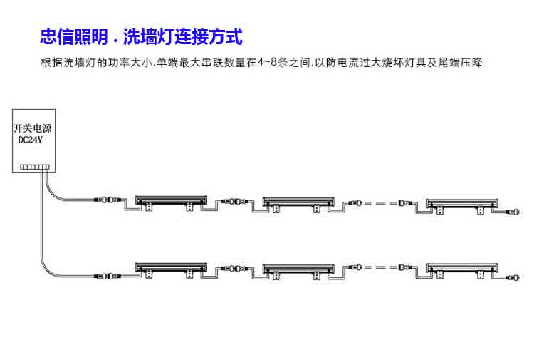 二:將燈具與電源線連接牢固,不用的線頭用防水膠帶包好;在安裝接線時洗墻燈串聯(lián)數(shù)量保持在5~6條左右,以防串聯(lián)較多時后端壓降大(詳見下面的示意圖);